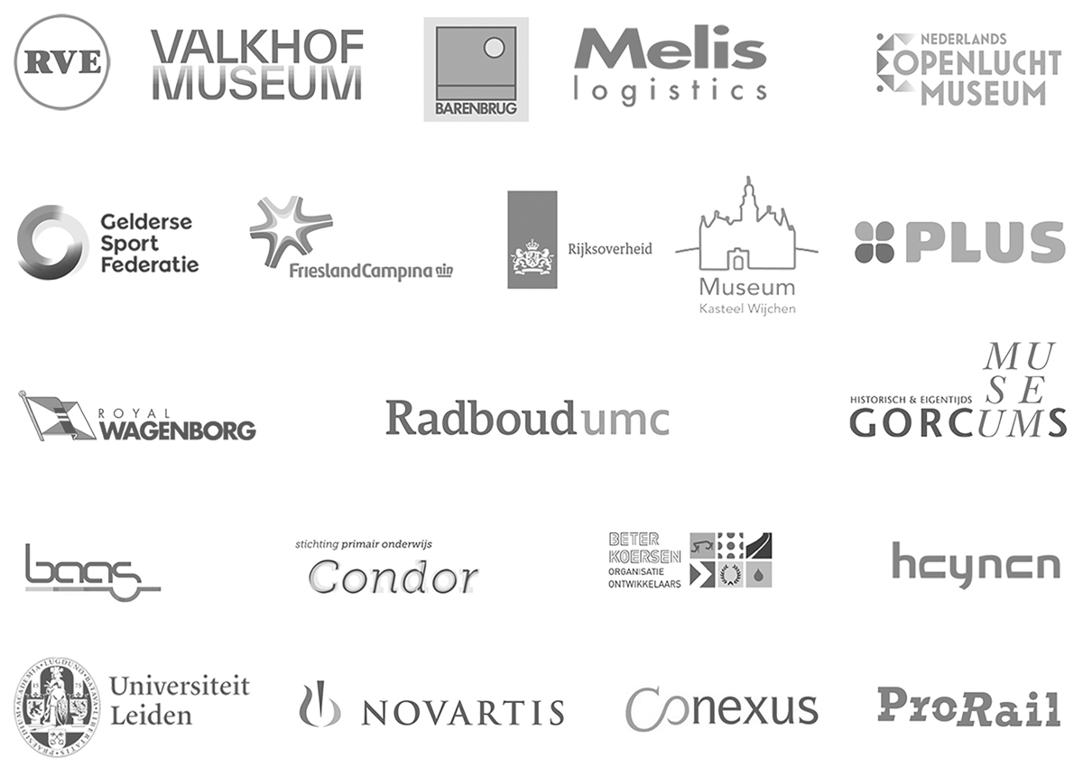 Stadsherstel Amsterdam, Verkroost BV, RVE Plantenexport, Valkhofmuseum, Barenbrug, Melis Logistics BV, Nederlands Openluchtmuseum, Gelderse Sportfederatie, FrieslandCampina, Rijksoverheid, Museum Wijchen, PLUS, Gorcums Museum, Royal Wagenborg, RadboudUMC, BeterKoersen, Heynen, SPO Condor, Universiteit Leiden, Conexus, ProRail.